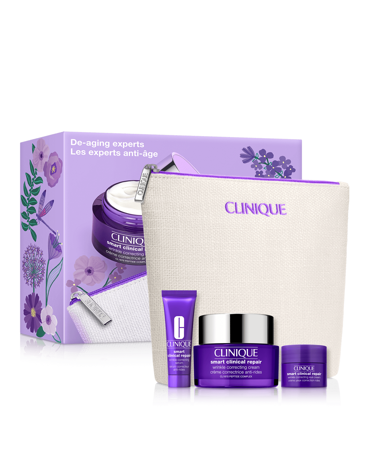 All set to outsmart wrinkles. Our smart de-ageing trio includes a powerful serum, eye cream, and full-size wrinkle cream. All in an exclusive bag.